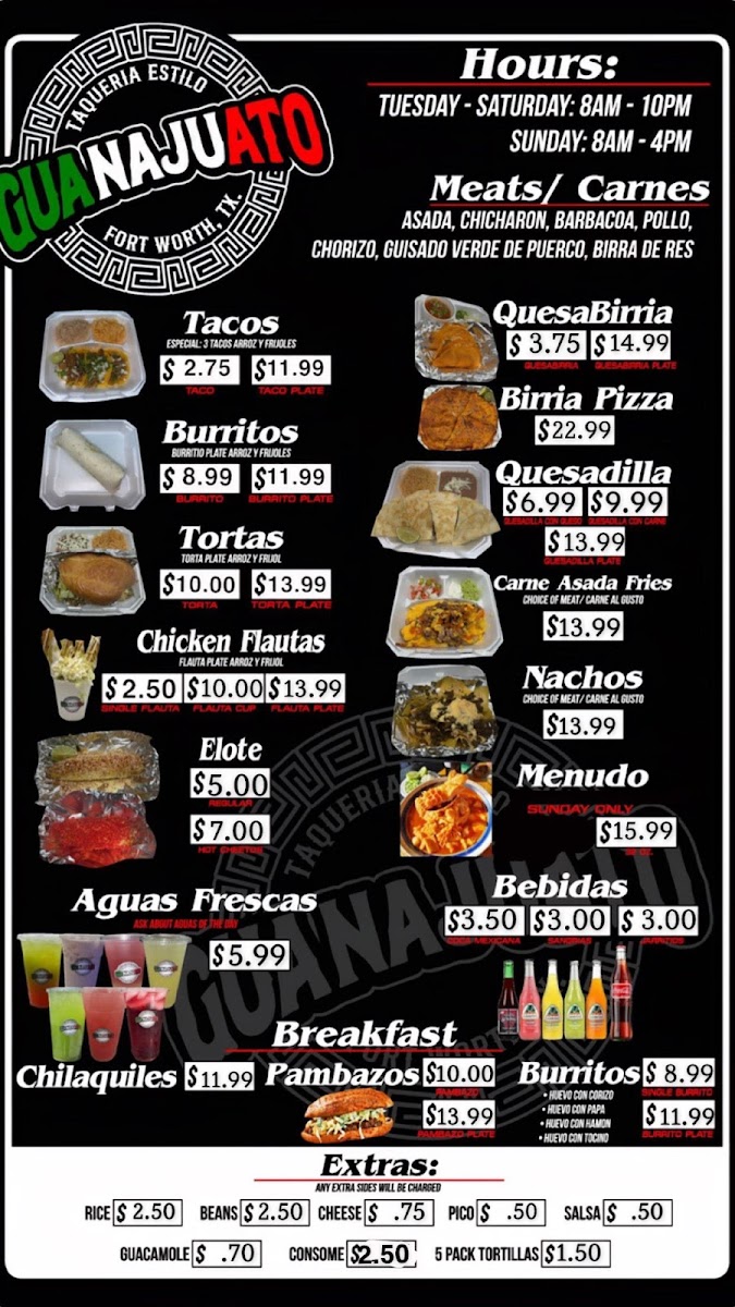 The Taqueria Estilo Guanajuato Menu brings the vibrant essence of traditional Mexican street food straight to Fort Worth, serving up a concise yet flavor-packed lineup that captures the heart of Guanajuato-style cuisine. At the core of the menu are the Street Tacos, the star of the show, offering a beautifully authentic experience with each bite. These tacos are made just the way you'd expect from a roadside taqueria in central Mexico-soft corn tortillas piled with juicy, seasoned meats, fresh cilantro, chopped onions, and a squeeze of lime that brings it all to life. The simplicity of the preparation allows the quality and flavor of the ingredients to shine, giving you that true street-style taco punch without overcomplication.